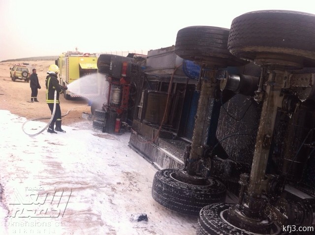 وأضاف أن الدفاع المدني باشر الحادث وقام بفصل البطارية وافرغ خزان الشاحنة وقام برش الرغوه على الديزل المتسرب.