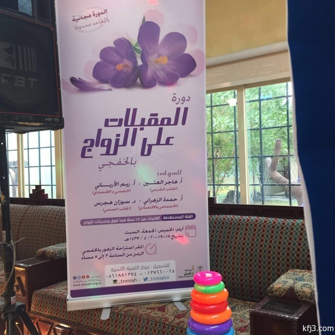 نظم مركز التنمية الأسرية بالخفجي دورة المقبلات على الزواج للمرة الثانية بعنوان (إكليلي وطرحتي٢) خلال أيام الخميس والجمعة والسبت 20/19/18-04-1437هـ بإستراحة الزهور، بالشراكه مع جمعية وئام للرعاية الأسرية بالدمام، حيث نفذن الدورة الأستاذات، هاجر العتين في الجانب الشرعي والصحي، وحمده الزهراني في الجانب الاجتماعي والاقتصادي، وريم الأرياني في الجانب النفسي والاقتصادي، والدكتوره مي العنزي في الجانب الطبي، بحضور 40 متدربة من المقبلات على الزواج.