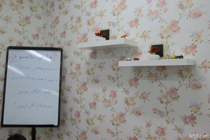 حيث حرص الأستاذ أحمد على تلبيس جدران الفصل بورق جدران جميل كما تم فرش الأرضية بموكيت وثير مزين برسومات وأحرف تعليمية للغة الإنجليزية