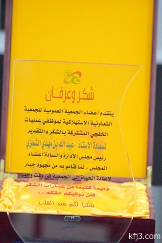 كرم مساهمي الجمعية التعاونية الاستهلاكية لموظفي عمليات الخفجي المشتركة اليوم الخميس 12-8-1437هـ مجلس إدارة الجمعية ممثلاً في رئيس المجلس عبدالله بن مهدي الشمري وذلك نظير الدور البارز و المميز في إعادة أحياء وتشغيل الجمعية وتحقيق أرباح في فترة وجيزة.
