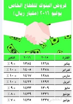 أظهرت النشرة الشهرية الصادرة عن مؤسسة النقد العربي السعودي، ارتفاع إجمالي القروض التي منحتها البنوك للمؤسسات الحكومية غير المالية والقطاع الخاص بنسبة 8% بنهاية شهر يوليو 2016 على اساس سنوي، لتصل إلى 1479.6 مليار ريال مقارنة بنحو 1374.8 مليار ريال خلال نفس الفترة من العام الماضي.