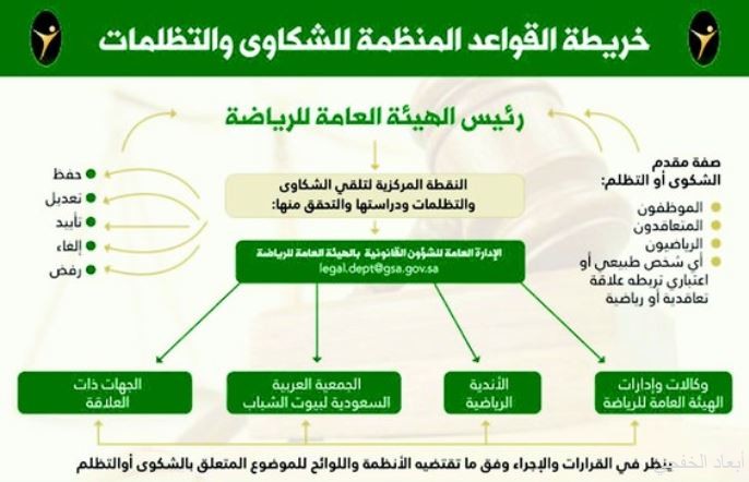 اعتمدت الهيئة العامة للرياضة القواعد المنظمة للشكاوى والتظلمات وإجراءات التعامل معها، وآليات الفصل في المنازعات المتعلقة باللاعبين الهواة والمدربين والعاملين بالأندية لتحقيق مجتمع رياضي متجانس تسود فيه روح التعاون المتبادل بين منسوبي الهيئة وذوي الصلة بالمجال الرياضي، وإقرار مبادئ العدل والإنصاف والشفافية كدعامة أساسية في بناء مجتمع مثالي داخل الهيئة وخارجها، وعلى المستوى الرياضي عامةً، ودعم حقوق منسوبيه على أسس تتوافق مع الأنظمة واللوائح المعمول بها وبما لا يتعارض معها، وجهات الاختصاص التي تتولى الشكاوى والإجراءات والآليات الخاصة بفض المنازعات والدعاوى المتعلقة باللاعبين الهواة والمحترفين والمدربين في كرة القدم في الأندية الرياضية، وتتولى غرفة فض المنازعات بالاتحاد السعودي لكرة القدم البت فيها، على أن يكون الاستئناف لدى مركز التحكيم الرياضي السعودي.