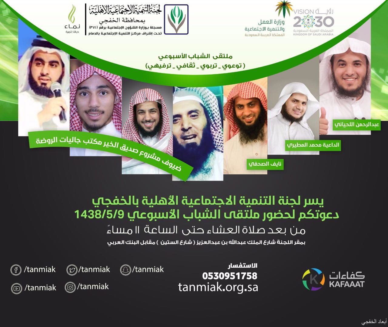 من منطلق رؤية لجنة التنمية الاجتماعية الأهلية بالخفجي وتحقيقا لرسالتها تدعو الجميع لحضور ملتقى الشباب الأسبوعي (توعوي -تربوي- ثقافي – ترفيهي) الذي يقام يوم الاثنين ١٤٣٨/٥/٩ بعد صلاة العشاء الي الساعة 11 مساءً بمقر اللجنة بشارع الملك عبدالله بن عبدالعزيز مقابل البنك العربي.