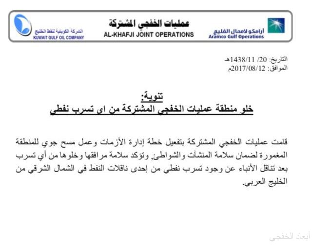 نوهت عمليات الخفجي المشتركة في بيان صحفي اليوم السبت 20-11-1438هـ الموافق 12-08-2017م خلو منطقة عمليات الخفجي من أي تسرب نفطي، حيث قامت العمليات بتفعيل خطة إدارة الأزمات وعمل مسح جوي للمنطقة المغمورة لضمان سلامة المنشآت والشواطئ.