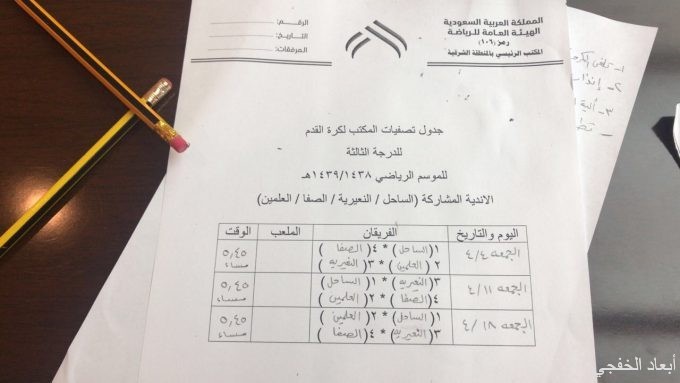 اجريت صباح اليوم الاثنين ٣٠-٣-١٤٣٩هـ في مكتب الهئية العامة للرياضية بالمنطقة الشرقية قرعة تصفيات المكتب لدوري المنطقة الشرقية لكرة القدم بحضور رئيس مكتب الهئية العامة للرياضة بالمنطقة الشرقية الاستاذ حامد سعيد السريعي وممثلي أندية المنطقة الشرقية الدرجة الثالثة المتأهله لتصفيات الشرقية وحضر من نادي العلمين المدرب معيض موسى القرني.