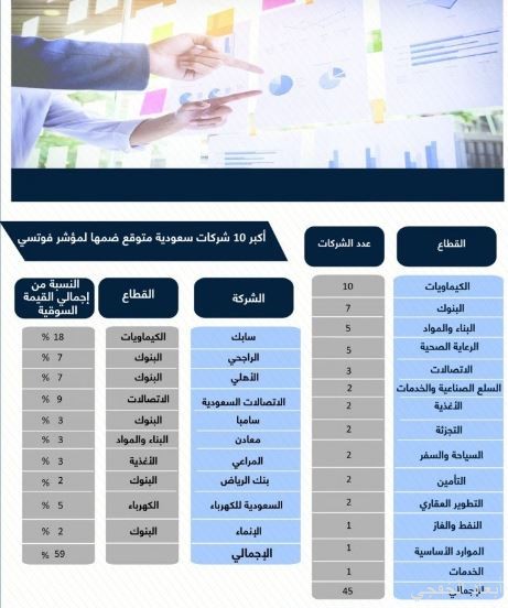 وتوقعت أن يتضمن مؤشر فوتسي 45 سهما مدرجة في السوق السعودي، تبلغ القيمة السوقية لأكبر 10 أسهم منها 1022 مليار ريال، وتمثل 59% من القيمة السوقية لتداول.