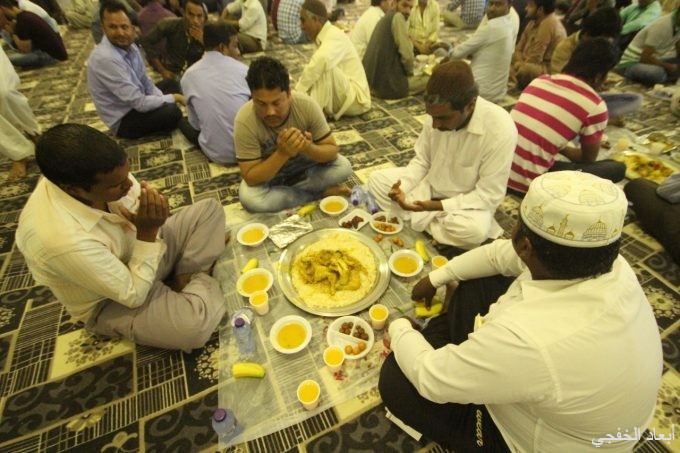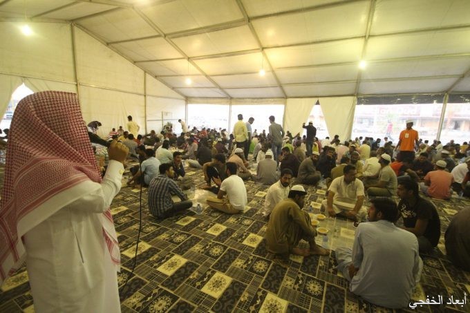 «أبعاد الخفجي» إلتقت مدير المكتب ثاني الحايطي والذي أوضح أن الخيام التي نصبت لإفطار الصائمين وضعت في ثلاثة أماكن متفرقة من أنحاء المحافظة في الصناعية وشارع البلدية و المحدود ( الخالدية ) ، حيث شهدت إقبالاً يتزايد مع الأيام من قِبل الجاليات المسلمة وعابري سبيل حيث يتم تفطير أكثر من ١١٠٠ شخص يومياً ، الأمر الذي دفع المكتب إلى زيادة الوجبات الغذائية لتغطية الأعداد الكبيره .