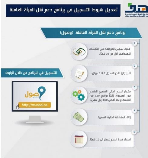 ويمكن للمرأة العاملة في القطاع الخاص التسجيل في برنامج “وصول” من خلال الرابطhttp://wusool.sa..