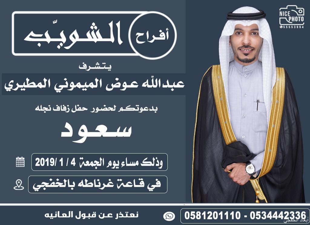 يتشرف عبدالله بن عوض الميموني المطيري بدعوتكم لحضور حفل زفاف نجله «سعود» وذلك مساء يوم الجمعة بتاريخ 28-04-1440هـ الموافق 04-01-2019م ، في قاعة غرناطة للإحتفالات بالخفجي .