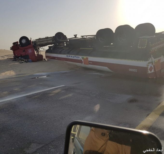 تباشر الآن إداراة المرور والدفاع المدني انقلاب شاحنة محمله بالنزين على طريق السفانية الحفر متجه لحفر الباطن وذلك لإزالتها ومن وقوع الخطر لاسمح الله .