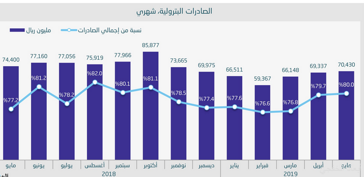 وبلغت قيمة الصادرات البترولية خلال شهر مايو الماضي 2018، نحو 70.4 مليار ريال بانخفاض مقداره 3.9 مليارات ريال،بنسبة 5.3 % عن شهر مايو 2018، كما ارتفعت نسبة الصادرات البترولية من إجمالي الصادرات من 77.2 %، في شهر مايو 2018 إلى 8 %، في شهر مايو 2019. وارتفعت قيمة الصادرات البترولية، بالمقارنة مع الشهر السابق أبريل 2019، بمقدار مليار وثلاثة وتسعين مليون ريال وبنسبة 1.6 %. وكانت الأرقام التي تنشرها مبادرة البيانات المشتركة (جودي) على موقعها الإلكتروني قبل أيام، قد أظهرت أن صادرات المملكة من النفط الخام هبطت إلى أدنى مستوى منذ أكتوبر 2017 إذ بلغت 6.94 ملايين برميل يوميا بانخفاض يزيد قليلا على 3 % عن الشهر السابق. وتراجعت الصادرات حوالي 240 ألف برميل يوميا من 7.18 ملايين برميل يوميا في أبريل. وانخفض إنتاج النفط السعودي 137 ألف برميل يوميا على أساس شهري، إلى 9.67 ملايين برميل يوميا، وهو أدنى مستوى في أكثر من أربع سنوات في حين هبط الطلب على المنتجات النفطية 420 ألف برميل يوميا على أساس سنوي إلى 2.09 مليون برميل يوميا.
