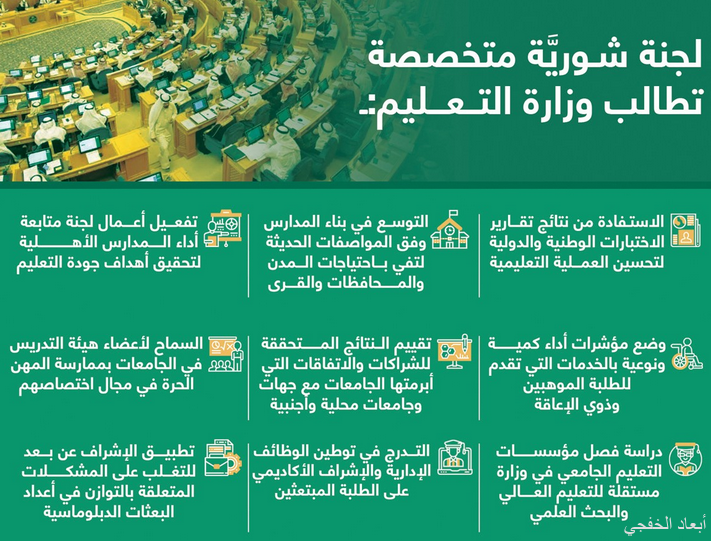 وكما نشرت «الرياض» وفق تقرير يختص بالعام المالي لوزارة التعليم 39 – 1440، فقد طالبت لجنة الشورى بدراسة فصل مؤسسات التعليم الجامعي في وزارة مستقلة للتعليم العالي والبحث العلمي، والسماح لأعضاء هيئة التدريس في الجامعات بممارسة المهن الحرة في مجال اختصاصهم بما يعمق خبراتهم، ويرفع من جودة أدائهم التعليمي وفق ضوابط تضمن فاعلية وانضباطية التنفيذ، وتفعيل أعمال لجنة متابعة أداء المدارس الأهلية لتحقيق أهدافها في المساندة باتخاذ القرارات التي تساعد في جودة التعليم الأهلي، تقييم النتائج المتحققة للشراكات والاتفاقات التي أبرمتها الجامعات مع جهات وجامعات محلية وأجنبية في ضوء التكاليف من جهة محايدة وتقديم تقرير مفصل للمجلس حول ذلك.
