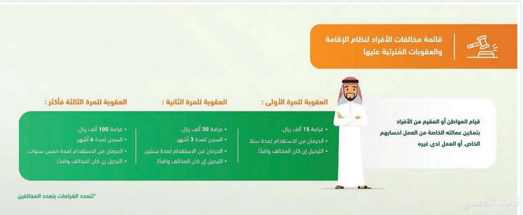 وحذرت المديرية العامة للجوازات أصحاب المنشآت من القيام بتشغيل العمالة المخالفة لنظامي الإقامة والعمل (بما فيهم العمالة المتغيبة عن العمل وخاصة العمالة المنزلية) من أنه في حال ارتكاب تلك المخالفات ستطبق بحقهم العقوبة التي تصل إلى غرامة مالية قدرها 100 ألف ريال، وحرمان المنشأة من الاستقدام لمدة خمس سنوات، والتشهير بالمنشأة، وسجن المدير المسؤول لمدة سنة مع الترحيل إن كان المدير وافداً، وتتعدد الغرامات بتعدد المخالفين.