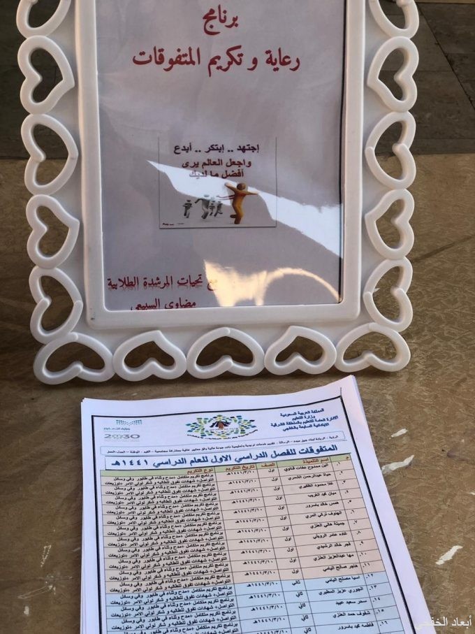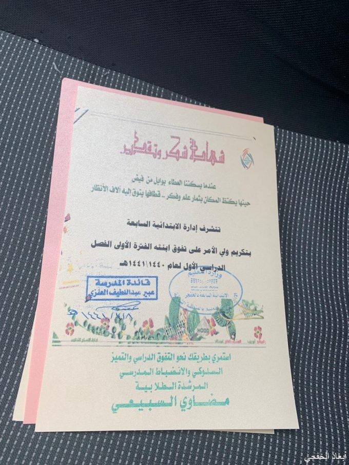 في بادرة جميلة لاقت إستحسان أولياء أمور الطالبات في الإبتدائية السابعة بالخفجي حيث بادرت المدرسة في تكريم الطالبات المتفوقات وذلك من خلال توزيع بطاقات التهنئة وإستلامها من قبل أولياء الأمور بعد تجهيز مكان بالقرب من مدخل المدرسة .