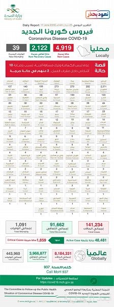 أعلنت وزارة الصحة اليوم تسجيل (4919) حالة مؤكدة جديدة لفيروس كورونا الجديد (COVID -19) ليصبح عدد الحالات المؤكدة في المملكة (141234) حالة، من بينها (48481) حالة نشطة لاتزال تتلقى الرعاية الطبية، ومعظمهم حالتهم الصحية مطمئنة، منها (1859) حالة حرجة، والبقية حالاتهم مطمئنة، كما سُجلت (2122) حالة تعافٍ جديدة، ليصل عدد المتعافين ولله الحمد إلى (91662) حالة.