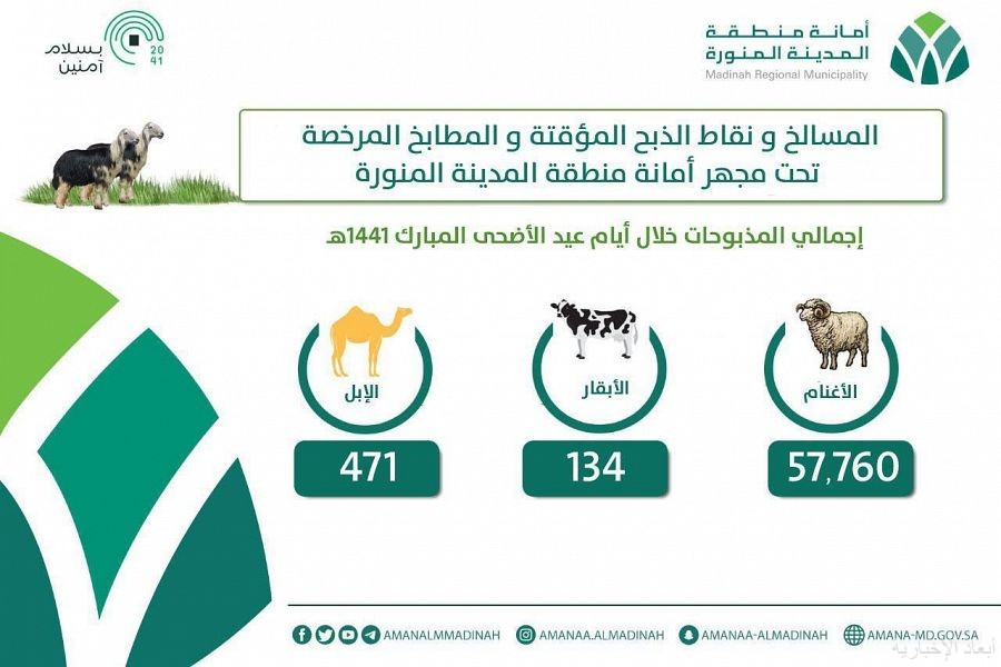 أشرفت أمانة منطقة المدينة المنورة خلال أيام عيد الأضحى المبارك لهذا العام 1441هـ على ذبح وسلخ 57.760 أضحية من الأغنام و471 من الإبل و134 من البقر في المسالخ ونقاط الذبح والمطابخ المرخصة بمنطقة المدينة المنورة وذلك وفقًا للاشتراطات الصحية والكشف البيطري على الأضاحي.