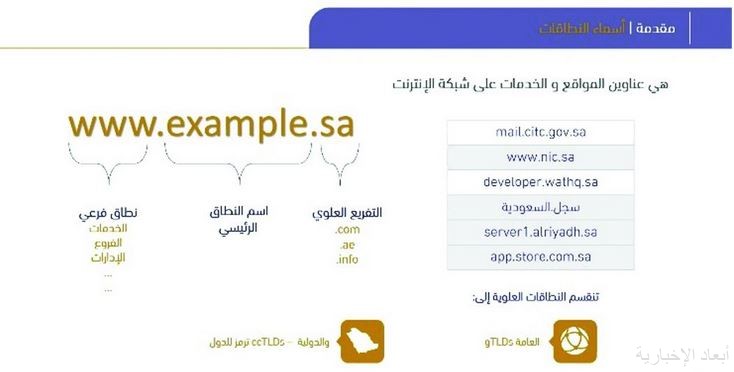 وأشار إلى أن دور الهيئة يتمثل في وضع القواعد والتنظيمات اللازمة لتسجيل أسماء النطاقات في المملكة وتسجيل أسماء النطاقات السعودية على الإنترنت وإدارة البنية التحتية لها وتوفير قواعد معلومات عن الأسماء المسجلة ودعم استخدام اللغة العربية في أسماء النطاقات والتنسيق مع الجهات المشرفة على أسماء العليا الخاصة بالدول على مستوى دول الخليج والعالم العربي والدولي.