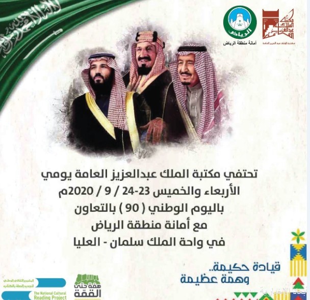 تحتفي مكتبة الملك عبدالعزيز العامة ممثلة بالمشروع الثقافي الوطني لتجديد الصلة بالكتاب بالتعاون مع أمانة منطقة الرياض باليوم الوطني (90) في واحة الملك سلمان بالعليا في يومي الأربعاء والخميس الموافق 23-24 سبتمبر الجاري بفعاليات متنوعة تشتمل على وجود حافلات مصادر التعلم المتنقلة والمكتبة المتنقلة، ومعرض صور عن المملكة، ، ورسم وجه للأطفال، ورسومات تشكيلية ورملية، وعرضة سعودية، وإطلاق بالونات، وتوزيع هدايا.