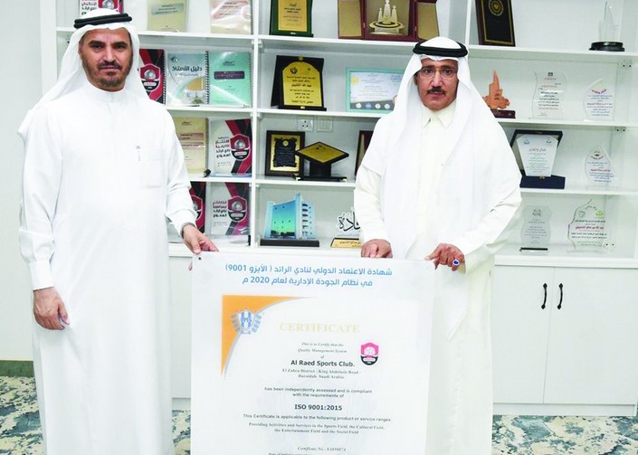 في إنجاز تنظيمي لنادي الرائد تحصل النادي على شهادة الآيزو في نظام الجودة الإدارية 9001 وذلك للعام 2020م الصادرة من المنظمة الدولية للمعايير ISO حيث تسلم رئيس مجلس الإدارة فهد المطوع هذه الشهادة مساء اليوم من منسوبي الشريك الاستشاري للنادي مكتب رواد الخبرة للاستشارات ممثلاً بالدكتور عبدالله الشتيوي الذي تسلمها من الجهة المانحة من خارج المملكة وذلك بحضور أعضاء مجلس إدارة النادي ومنسوبي مكتب رواد الخبرة للاستشارات