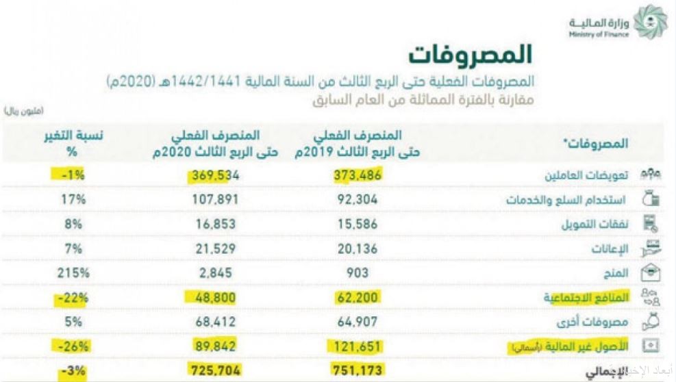 وانخفضت مصروفات الميزانية حتى الربع الثالث 2020م بنسبة 3 % عن نفس الفترة السابقة خلال سنة 2019م وأكبر انخفاض في البنود كان في الأصول الرأسمالية بنسبة 26 % تلاها المنافع الاجتماعية بنسبة 22 % مع انخفاض ضئيل في تعويضات العاملين بنسبة 1 %