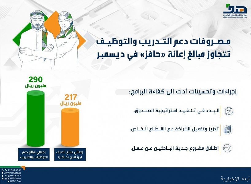 كشف صندوقُ تنمية الموارد البشرية “هدف” أنَّ إجمالي مبالغ الدعم المصروفة على برامج ومبادرات دعم التدريب والتوظيف والتمكين وصلت إلى 290 مليون ريال، خلال شهر ديسمبر (2020)، متجاوزة للمرة الثانية على التوالي مبالغ الدعم المصروفة على برنامج إعانة البحث عن عمل “حافز”، التي بلغت 217 مليون ريال، للفترة ذاتها.