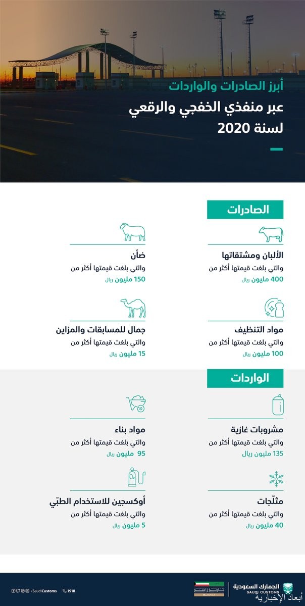 وكشفت الجمارك عن أبرز الصادرات والواردات عبر منفذي الخفجي والرقعي ببين المملكة والكويت خلال عام 2020 في الإنفوجرافيك التالي:
