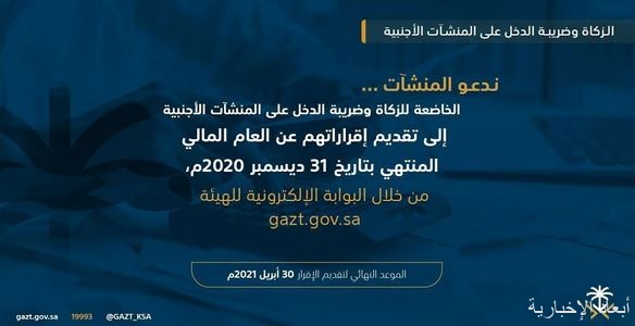 أكدت الهيئة العامة للزكاة والدخل أن آخر موعد لتقديم الإقرارات الزكوية للمنشآت الخاضعة للزكاة والإقرارات الضريبية للشركات غير السعودية الخاضعة لضريبة الدخل هو 18 رمضان 1442هـ، الموافق 30 أبريل 2021م، عن العام المالي المنتهي في 31 ديسمبر 2020م.