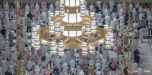 وبين أنه تضيء عدد من وحدات إنارة كتب عليها لفظ الجلالة الأركان العلوية للأقواس المعمارية داخل المسجد الحرام وأروقته.