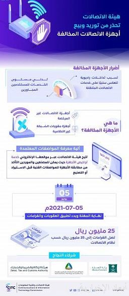 حذرت هيئة الاتصالات وتقنية المعلومات موردي أجهزة الاتصالات من توريد وتوزيع وبيع الأجهزة المخالفة للمواصفات المعتمدة من الهيئة ومن ضمنها أجهزة الاتصالات غير المرخصة وأجهزة مقويات الشبكة غير النظامية، داعيةً المخالفين إلى إعادة الأجهزة المخالفة لمصادرها أو إتلافها؛ تفاديًا لتطبيق العقوبات والغرامات المالية المقررة عقب نهاية المهلة المحددة في 2021/7/5م .