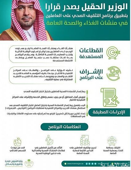 أصدر معالي وزير الشؤون البلدية والقروية والإسكان الأستاذ ماجد بن عبدالله الحقيل، قرارا بتطبيق برنامج التثقيف الصحي على العاملين في منشآت الغذاء والصحة العامة، من خلال ربط إصدار الشهادة الصحية للعاملين باجتياز اختبار التثقيف الصحي بالمراكز التنفيذية للاختبار بالمملكة وفق برنامج التثقيف الصحي، وذلك لرفع مستوى الوعي لدى العاملين بها واتباع أسلوب الرقابة الذاتية وتجنب الممارسات الصحية الخاطئة، وسيقدم البرنامج بعدة لغات مختلفة حسب جنسية العامل ويغطى الأنشطة المستهدفة.