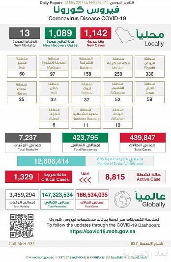 وفي نفس السياق أعلنت الصحة إحصائية جديدة لمستجدات كورونا في المملكة خلال الـ 24 ساعة الماضية تضمنت تسجيل (1142) حالة مؤكدة وتعافي(1089) حالة فيما بلغ عدد الحالات النشطة (8815) حالة منها (1329) حالة حرجة.