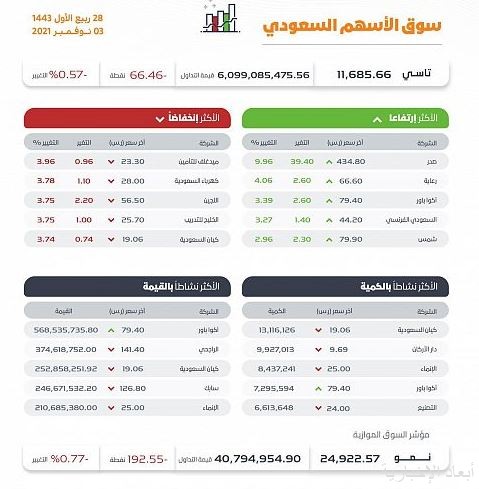 أغلق مؤشر الأسهم السعودية الرئيسية اليوم منخفضًا بـ66.46 نقطة ليقفل عند مستوى 11685.66 نقطة, وبتداولات بلغت قيمتها 6 مليارات ريال.