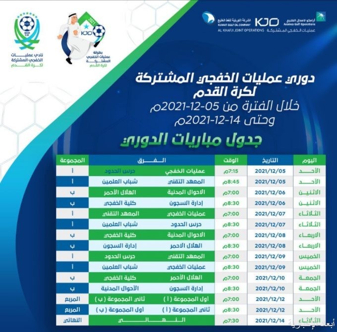 أجرت اللجنة المنظمة لدوري عمليات الخفجي المشتركة لكرة القدم قرعة الفرق المشاركة بالدوري الذي ينطلق بتاريخ 05-12-2021م وحتى تاريخ 14-12-2021م ويضم الدوري ثمانية فرق تمثل الجهات التالية (عمليات الخفجي المشتركة – الأحوال المدنية – حرس الحدود – نادي العلمين – المعهد السعودي التقني – الهلال الأحمر – إدارة السجون).