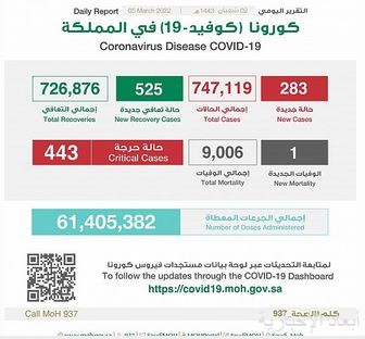 وبينت أن إجمالي عدد الإصابات في المملكة بلغ (747119) حالة وبلغ عدد حالات التعافي (726876) حالة ، والحالات النشطة (11237). بينما وصل إجمالي عدد الوفيات في المملكة (9006) حالة.