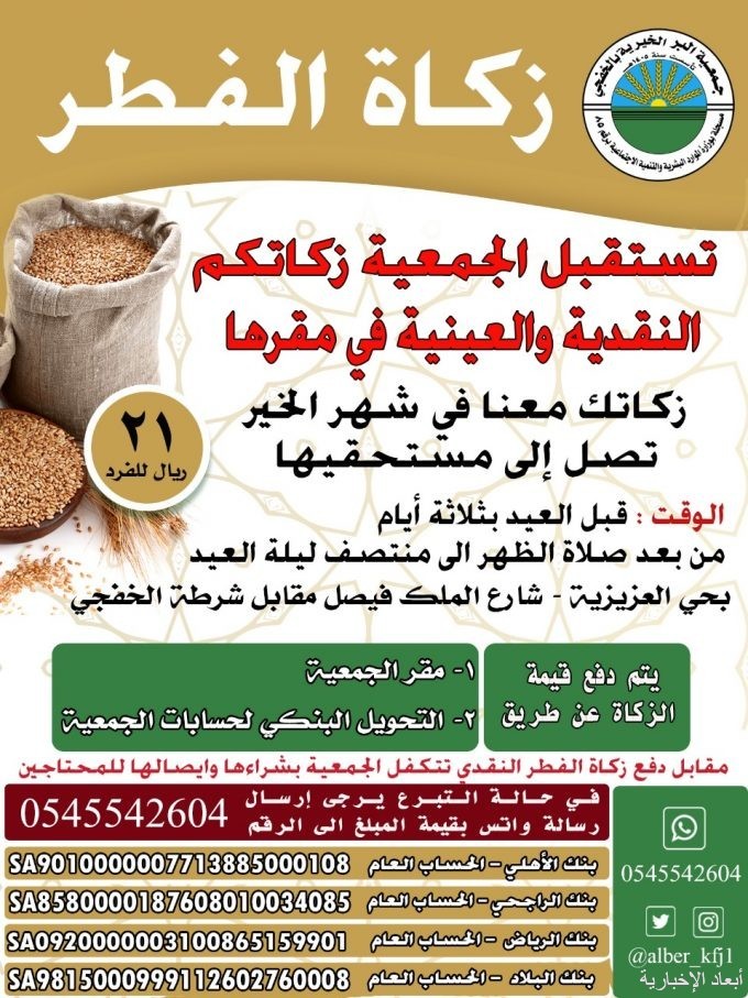 أعلنت جمعية البر الخيرية بالخفجي عن إستقبال زكاة الفطر النقدية والعينية وذلك في مقر الجمعية مقابل شرطة الخفجي بحي العزيزية شارع الملك فيصل .