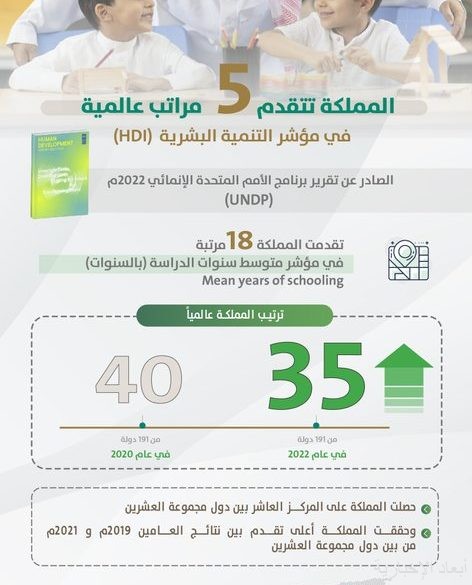 تقدّمت المملكة 5 مراتب في نتائج مؤشر التنمية البشرية الصادر عن تقرير برنامج الأمم المتحدة الإنمائي 2022م،