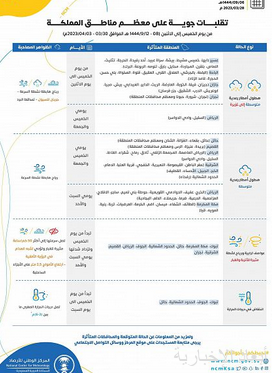 وابتداءً من يوم غد الخميس، تشهد مناطق تبوك (خاصة أجزاءها الشرقية)، مكة المكرمة (خاصة أجزاءها الشرقية)، حائل، الحدود الشمالية، الجوف، الرياض، القصيم والشرقية (خاصة أجزاءها الشمالية)، عواصف ترابية ورياح نشطة مثيرة للأتربة والغبار تصل سرعتها إلى أكثر من 50كم /ساعة تؤدي إلى شبه انعدام في الرؤية الأفقية وارتفاعاً للأمواج على المدن الساحلية منها لتصل إلى أكثر من 2,5 متر، وتزداد شدتها يومي السبت والأحد.