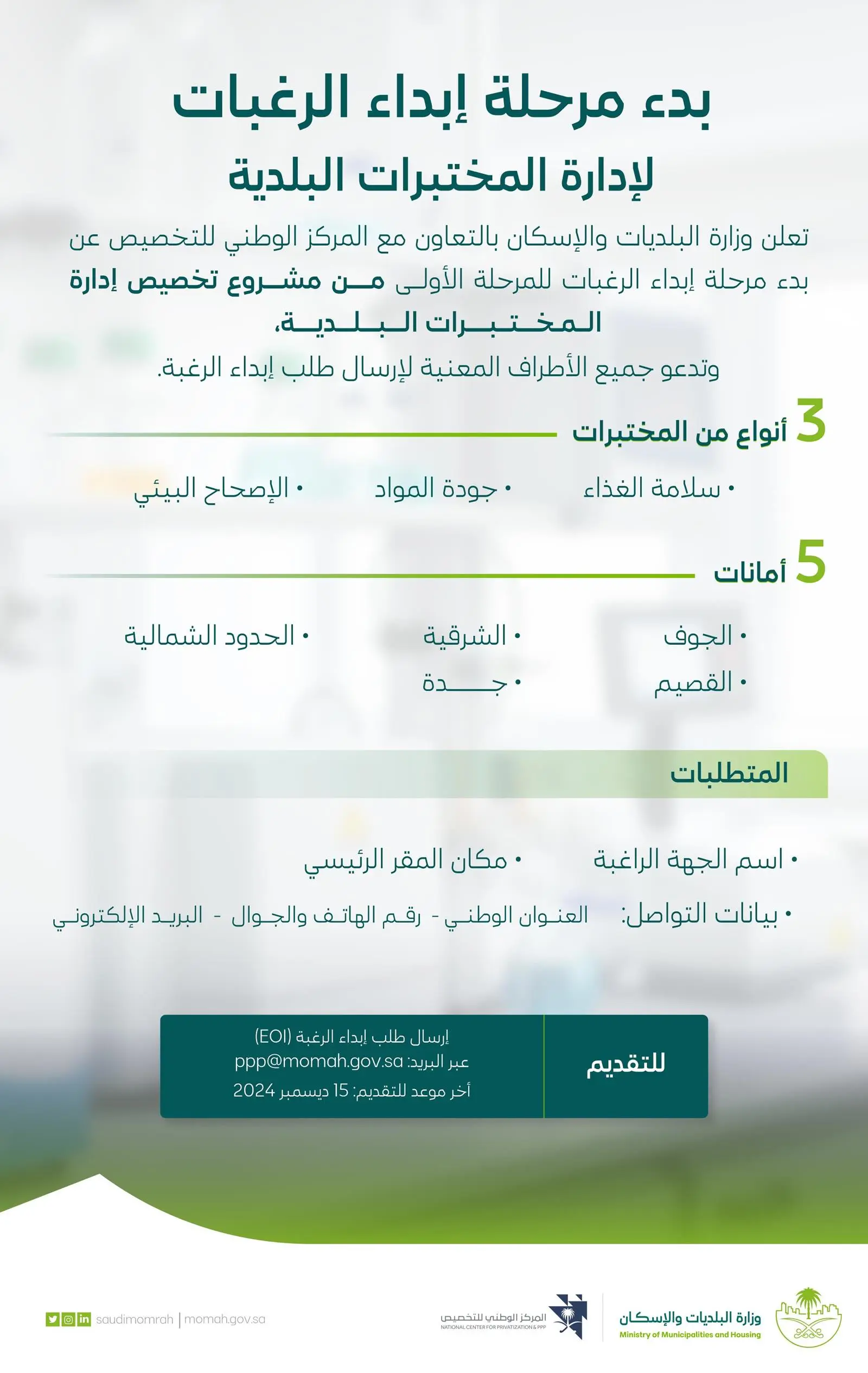 أعلنت وزارة البلديات والإسكان بالتعاون مع المركز الوطني للتخصيص، عن بدء مرحلة إبداء الرغبات لمشروع تخصيص إدارة المختبرات البلدية في خمس أمانات ، وهي (أمانة منطقة الجوف، وأمانة المنطقة الشرقية، وأمانة منطقة الحدود الشمالية، وأمانة منطقة القصيم، وأمانة محافظة جدة)، وذلك بهدف تعزيز الشراكة بين القطاع الحكومي والقطاع الخاص في رفع كفاءة خدمات المختبرات البلدية بالمملكة.