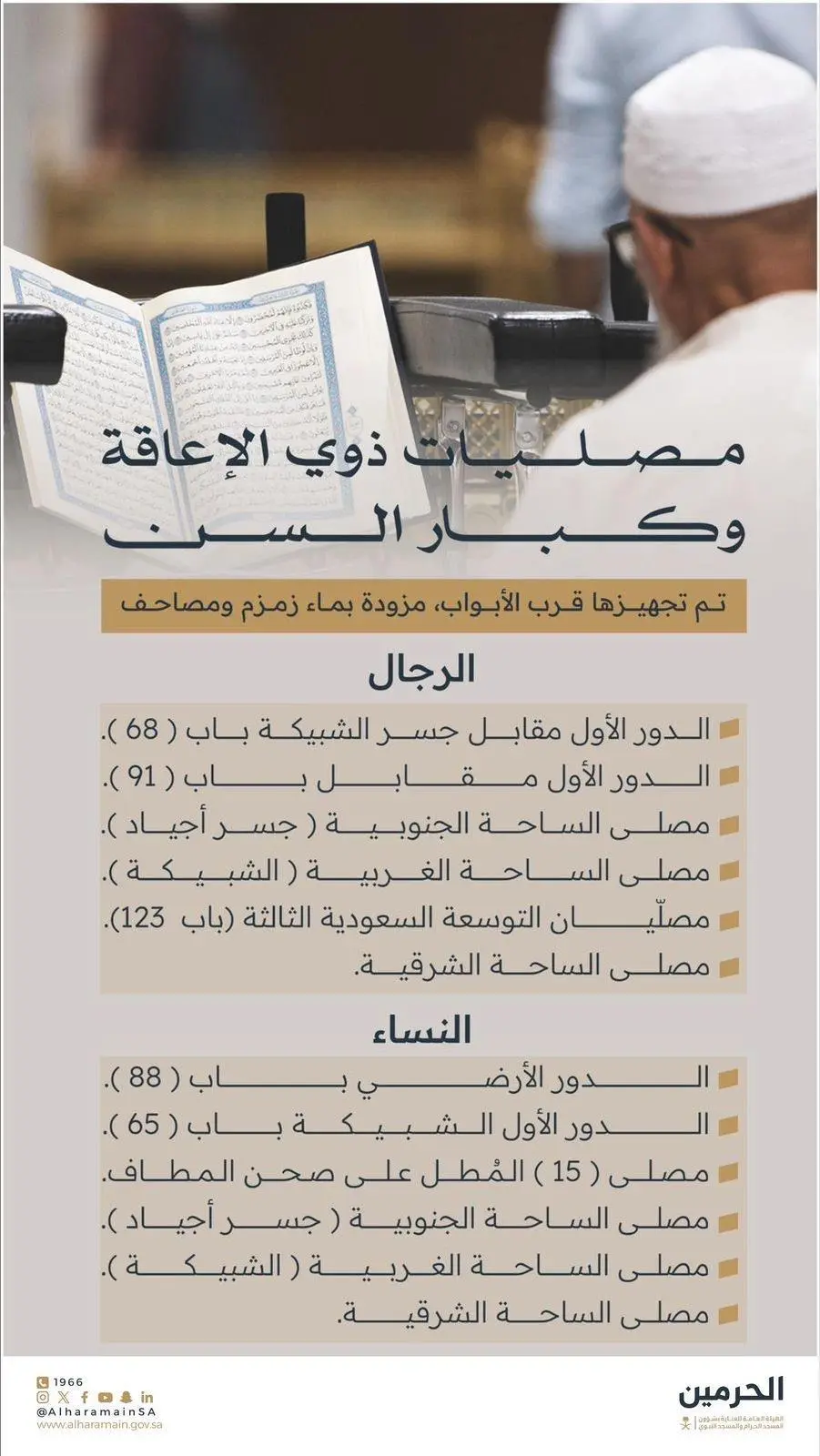 وخصصت الهيئة للرجال من ذوي الإعاقة الدور الأول مقابل بوابة 91، والدور الأول مقابل جسر الشبيكة بوابة رقم 68 ، ومصلى الساحة الجنوبية “جسر أجياد” ومصلى الساحة الغربية “الشبيكة” ومصليين في التوسعة السعودية الثالثة باب 123 ومصلى الساحة الشرقية.