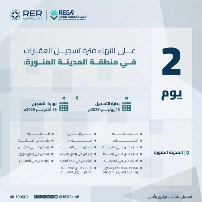 وبالمدينة المنورة سينتهي التسجيل لـ 40,496 قطعة عقارية ضمن نطاق الأحياء التالية: حي الرمانة، حي الروابي، حي الغراء، حي النبلاء، حي شوران، مخطط شركة المقر للتطوير والتنمية (مشروع الماجدية)، جزء من حي طابة، جزء من حي العزيزية، جزء من حي السد، جزء من حي العهن، جزء من حي رهط، جزء من حي وادي مذينب، جزء من حي وادي مهزور، أجزاء من حي الحديقة، أجزاء من حي سكة الحديد، أجزاء من مخطط العام لرؤى المدينة، أجزاء من حي المقر.