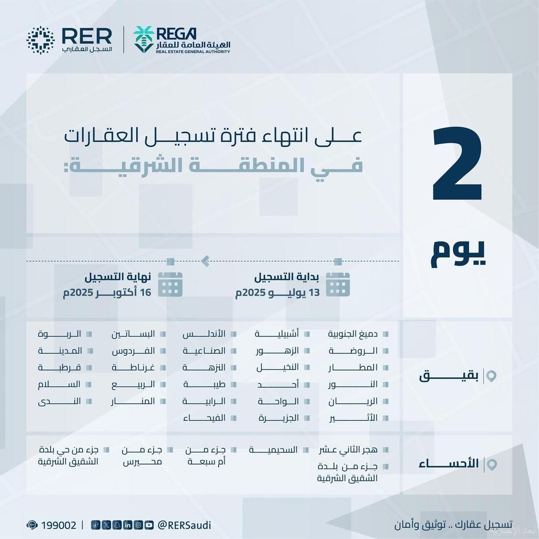 كما ينتهي التسجيل لـ 17,535 قطعة عقارية بالمنطقة الشرقية ضمن نطاق الأحياء التالية بمحافظة بقيق في: (حي دميغ الجنوبية، حي أشبيلية، حي الأندلس، حي البساتين، حي الربوة، حي الروضة، حي الزهور، حي الصناعية، حي الفردوس، حي المدينة، حي المطار، حي النخيل، حي النزهة، حي غرناطة، حي قرطبة، حي النور، حي أحد، حي طيبة، حي الربيع، حي السلام، حي الريان، حي الواحة، حي الرابية، حي المنار، حي الندى، حي الأثير، حي الجزيرة، حي الفيحاء)، والأحياء التالية بمحافظة الأحساء: حي هجر الثاني عشر، السحيمية، جزء من أم سبعة، جزء من محيرس، جزء من حي بلدة الشقيق الشرقية، جزء من بلدة الشقيق الشرقية.