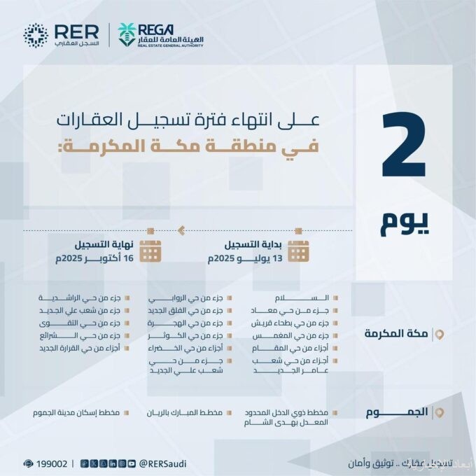 وبيّنت “الهيئة” أنّ التسجيل العيني للعقار سينتهي بمنطقة مكة المكرمة لـ50,259 قطعة عقارية بمدينة مكة المكرمة ومحافظة الجموم، ضمن نطاق الأحياء التالية: حي السلام، جزء من حي الروابي، جزء من حي الراشدية، جزء من حي معاد، جزء من حي الفلق الجديد، جزء من شعب علي الجديد، جزء من حي بطحاء قريش، جزء من حي الهجرة، جزء من حي التقوى، جزء من حي شعب علي الجديد، جزء من حي المغمس، جزء من حي الكوثر، جزء من حي الشرائع، أجزاء من حي المقام، أجزاء من حي الخضـراء، أجزاء من حي القرارة الجديد، أجزاء من حي شعب عامر الجديد، مخطط المبارك بالريان، مخطط ذوي الدخل المحدود المعدل بهدى الشام، مخطط إسكان مدينة الجموم.