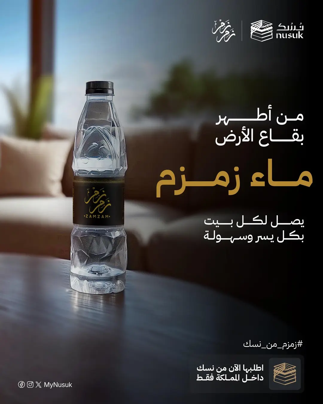 أطلق تطبيق “نسك” التابع لوزارة الحج والعمرة، خدمة جديدة تتيح لجميع المواطنين والمقيمين في المملكة الحصول على عبوات ماء زمزم المبارك بعبوات سعة 330 مل، وإيصالها مباشرة إلى منازلهم في مختلف مناطق المملكة.