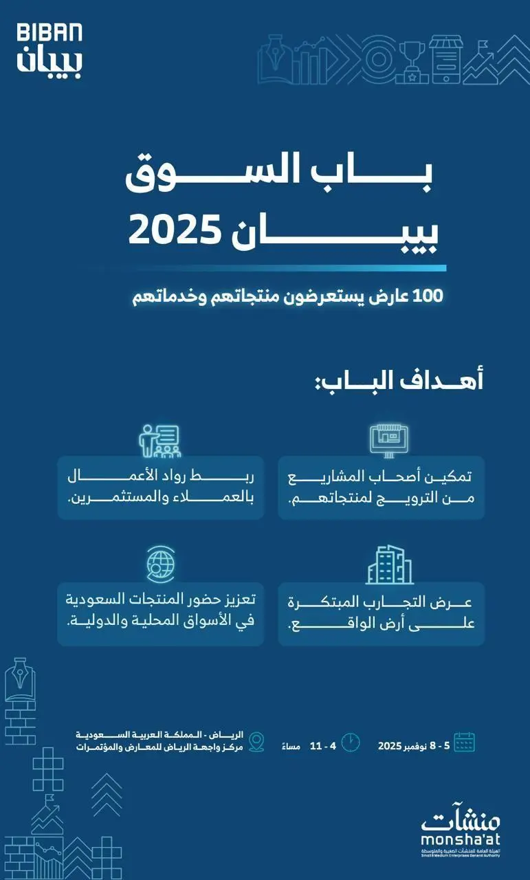 يحتضن ملتقى “بيبان 2025″، الذي تنظمه الهيئة العامة للمنشآت الصغيرة والمتوسطة “منشآت” خلال الفترة من 5 إلى 8 نوفمبر المقبل في مركز واجهة الرياض للمعارض والمؤتمرات، تحت شعار “وجهة عالمية للفرص”، أكثر من (100) عارض من رواد الأعمال وأصحاب المنشآت الصغيرة والمتوسطة من داخل المملكة وخارجها ضمن ” باب السوق”.