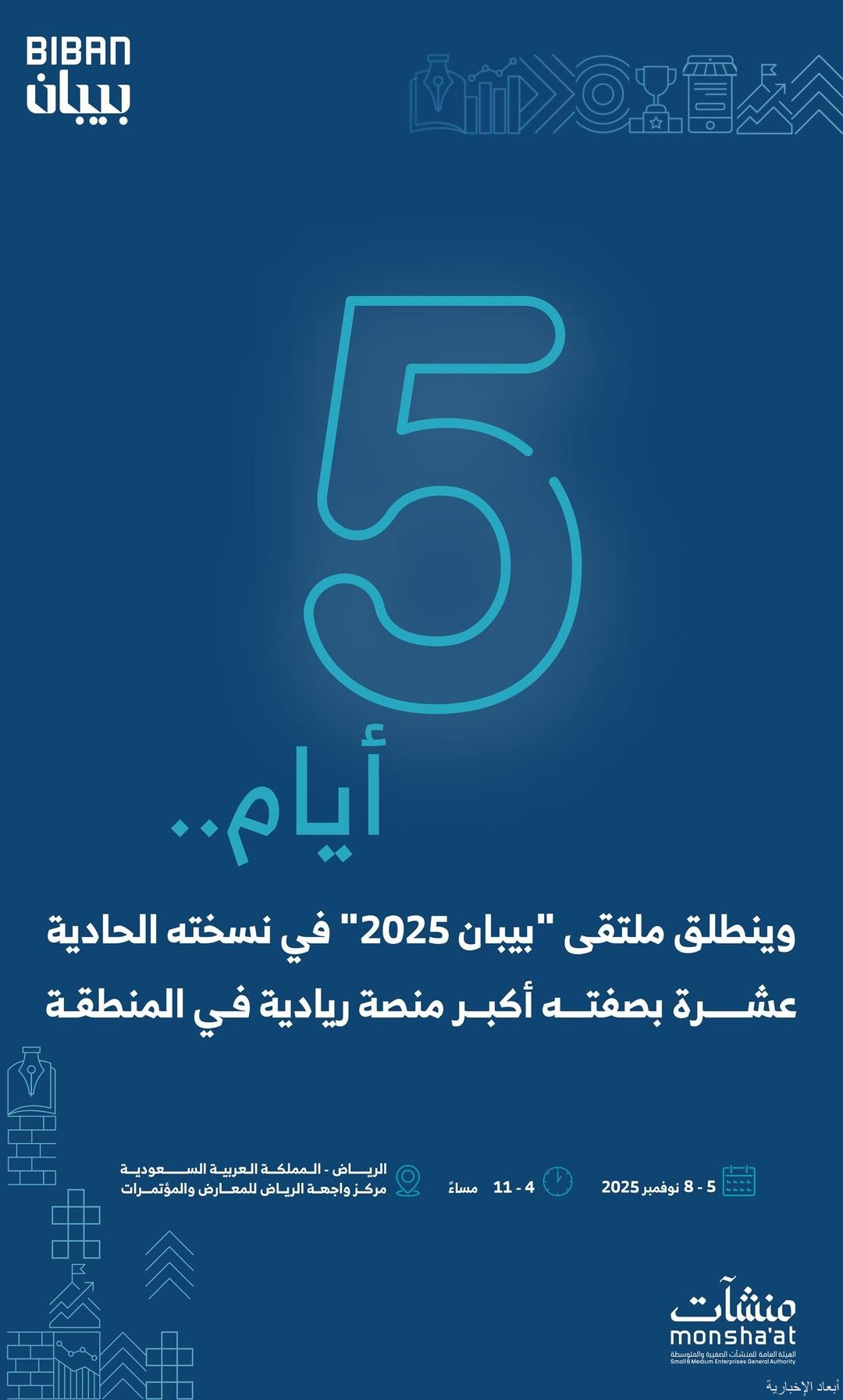 تنطلق الأربعاء المقبل فعاليات ملتقى “بيبان 2025” الذي تنظمه الهيئة العامة للمنشآت الصغيرة والمتوسطة “منشآت” خلال الفترة من 5 إلى 8 نوفمبر المقبل في مركز واجهة الرياض للمعارض والمؤتمرات، تحت شعار “وجهة عالمية للفرص”، بمشاركة أكثر من (150) دولة، و(200) متحدث محلي وعالمي، إلى جانب (150) جهة ممكنة من القطاعين الحكومي والخاص، إضافة إلى إعلان عدة إطلاقات واتفاقيات ملياريه.
