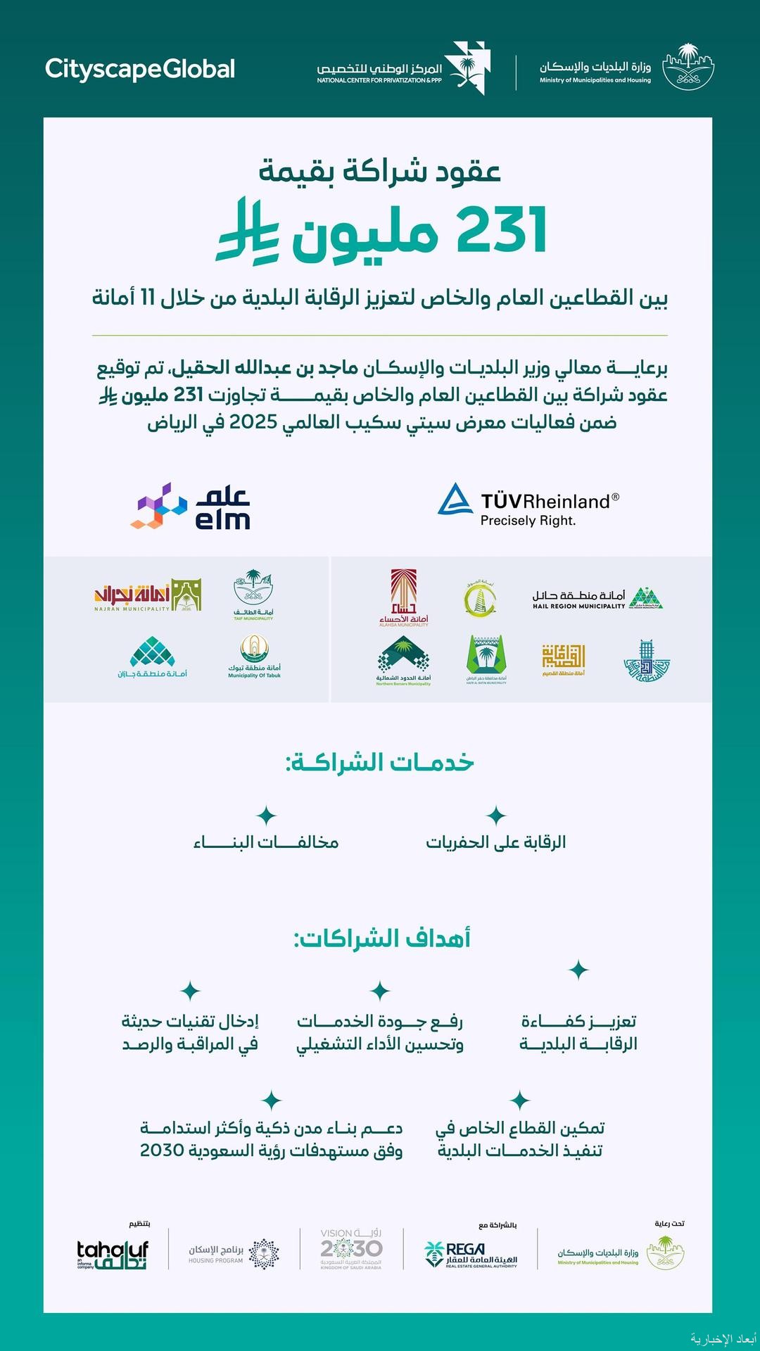 وجاء توقيع العقود بالتعاون بين وزارة البلديات والإسكان والمركز الوطني للتخصيص، بقيمة إجمالية تجاوزت 231 مليون ريال، في إطار جهود الوزارة لتعزيز كفاءة القطاع البلدي وتوسيع نطاق الشراكات مع القطاع الخاص، بما يسهم في رفع جودة الخدمات وتحسين الأداء التشغيلي والرقابي في مدن المملكة.