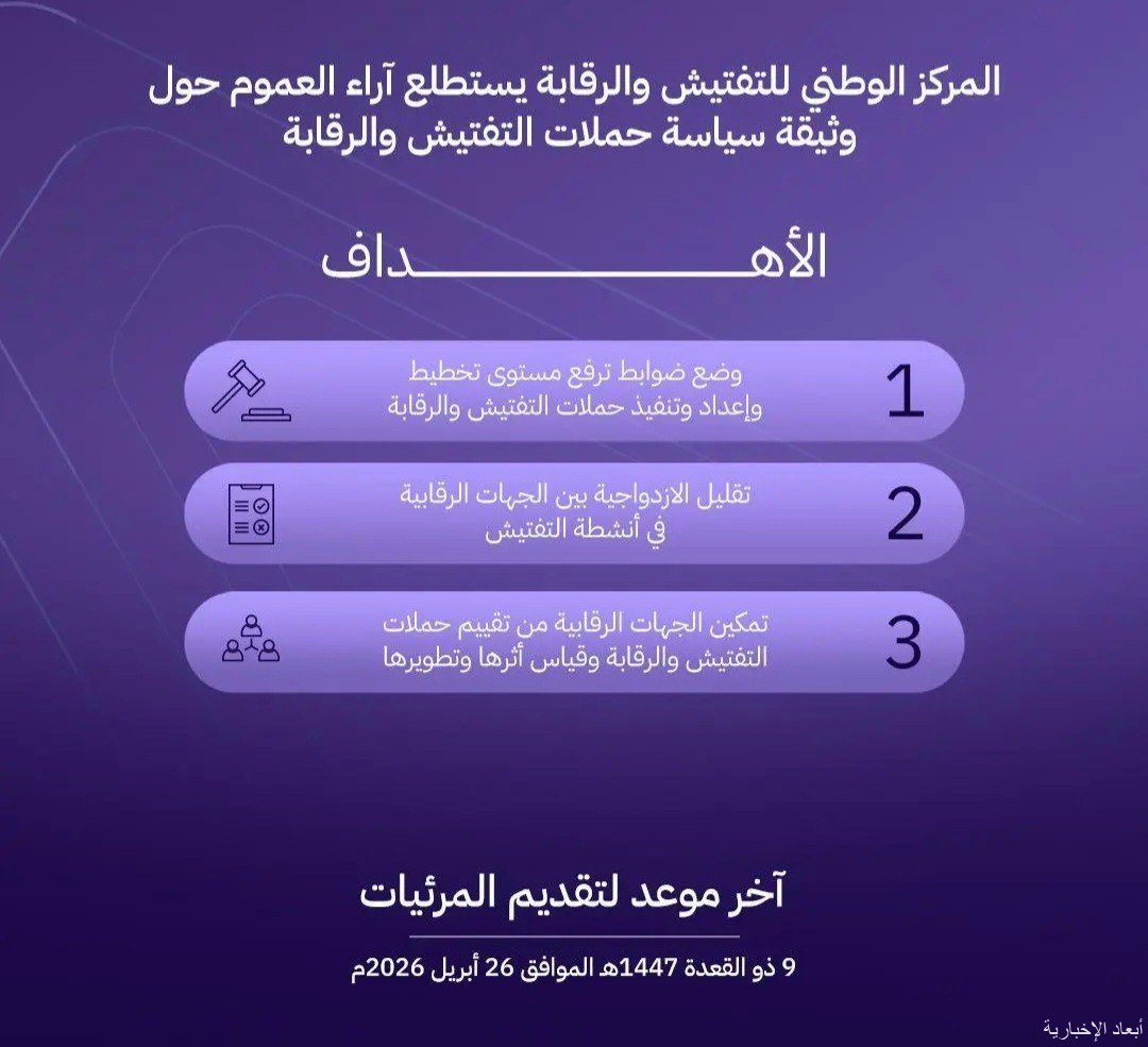 وحث المركز جميع الجهات ذات العلاقة والمهتمين على إبداء ملاحظاتهم ومرئياتهم حول الوثيقة قبل نهاية يوم السبت 9 من ذو القعدة 1447هـ، الموافق 26 أبريل 2026م، عبر المنصة الإلكترونية الموحدة لاستطلاع آراء العموم “استطلاع”.